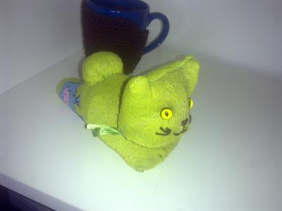 Aber erstmal die Sockenkatze für meine Freundin, die auch schon die Mützen und die Häkelblüten bekommt.